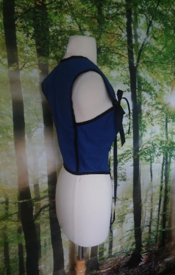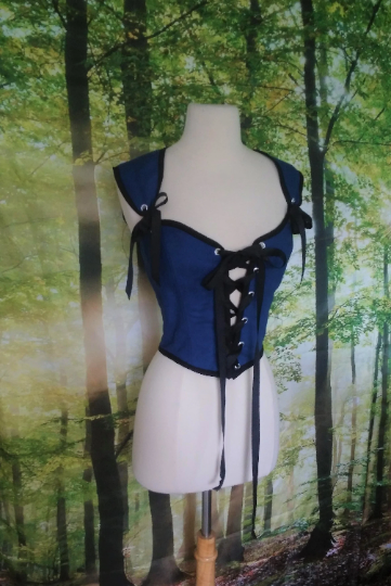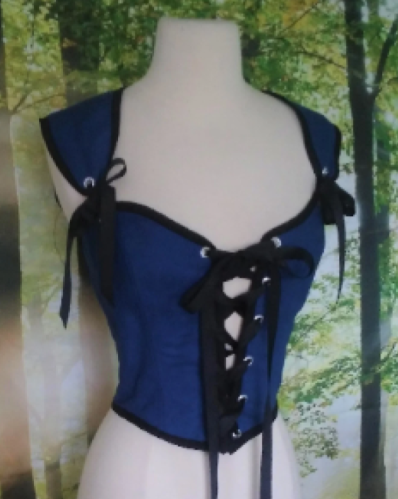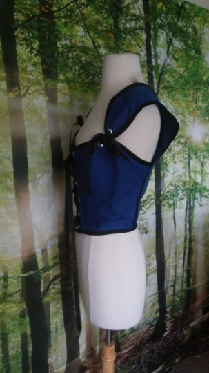 This Bar Maid Bodice is made from a strong twill in the color of your choice and all edges are accented with a bold bias tape. The front has two thick strips of metal boning, gold or silver grommets, and lacing to match the bodice.