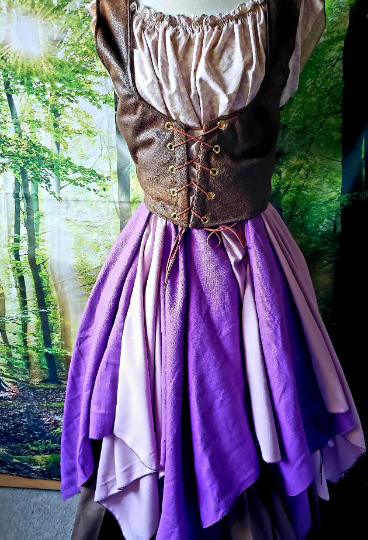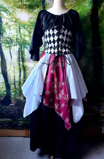 These swishy, flirty skirts are so perfect to wear add splashes of color and dimension to your outfit. Made from two full circles of fabric, these skirts gather at the waistline with minimal bulk but incredible fullness, perfect for dancing and frolicking around the faire. So fun to wear on their own, over leggings, or another longer skirt. From the waist, these skirts have 8 "points" of alternating colors and range in length from 16" to 28".