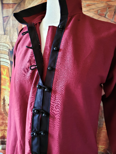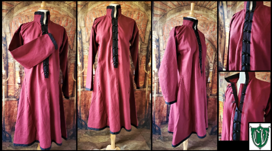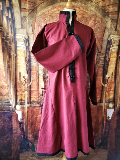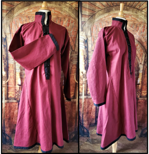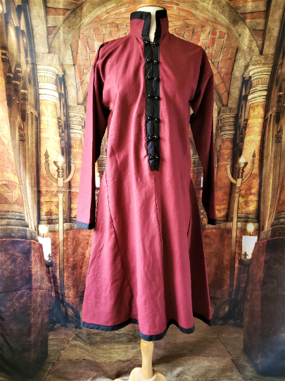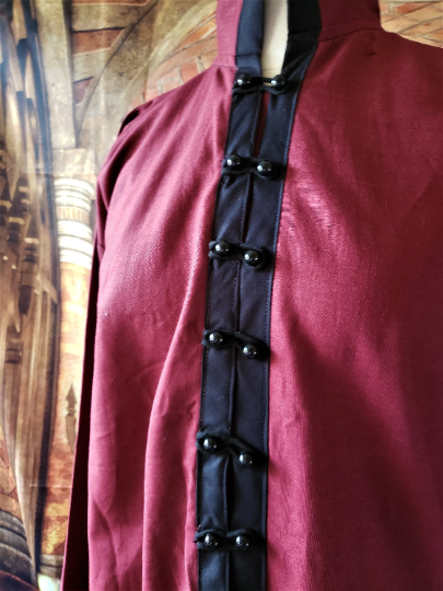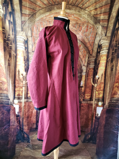 Fitted torso and flared out from the hips to the knee, the Adviser's Tunic cuts a slim and dashing figure. 7 rows of buttons down the front secure together with a cotton cord and sport a 4 inch "modesty panel" to cover your under layers from peaking through. Choose your main color and accent color (accent will be black by default unless you ask for something else). Buttons are black and round by default, but can be different upon request.