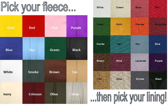 Choose your colors and length. Comes with tied closure. Totally machine washable and stain resistant.