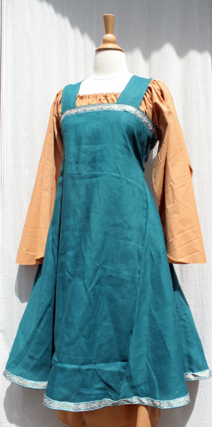 ***About*** The most distinctive dress for a Viking woman was the apron dress, which was worn over an underdress or kirtle and decorated with jewelry according to her station. Apron dresses are easy to slip on and off inside a tent without a mirror and comfortable enough to sleep in. The extra gores in the skirt give almost a full circle of mobility, assuring that you can run, jump, even cartwheel in this dress. You'll feel like you're wearing comfy jammies, even though you'll be turning heads with your fine Viking self. ;)