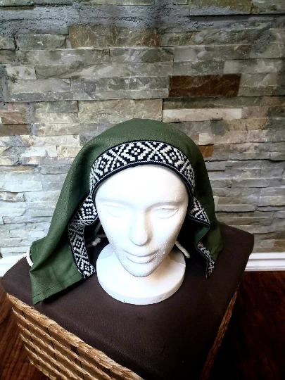 For a simple and femenine way to cover your hair, this head scarf is perfect. A fully lined piece of 100% linen with a trim of your choice (or none at all!) along the front. Under the top trim, a cord is fastened on either side to tie under your hair and remain hidden, leaving only the scarf showing. Twist up your hair in beautiful braids or let it fall freely, secure under the modesty of the head scarf.