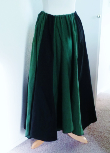 For a unique look that you can match to any outfit, a two color skirt is perfect. Durable and sturdy, this skirt is a great staple to have in any wardrobe. It has an drawstring waistband, but I can easily make it elastic upon request.