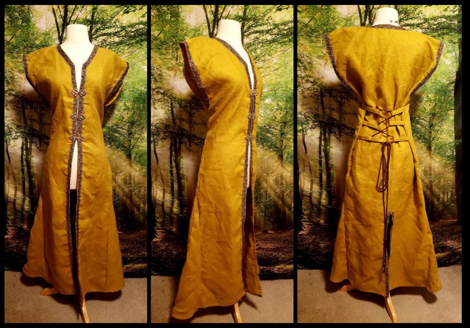 For the pirate girls out there, a play on my men's surcoat pattern: the women's fitted surcoat! This jacket is made from cozy, crisp linen with your choice of jaquard trim accenting the front and armholes. The jacket falls to the ankle in the back and sweeps up to mid-thigh in the front where it splits down the center, clasped together over the chest with four metal hooks. The sides each have a split to the hip for extra mobility, and the back has lacing to pull the jacket around your curves flatteringly. The darts at the bust and hood make sure to flatter your figure as you look vicious.