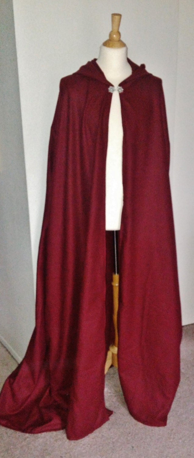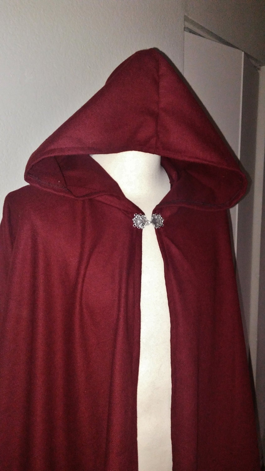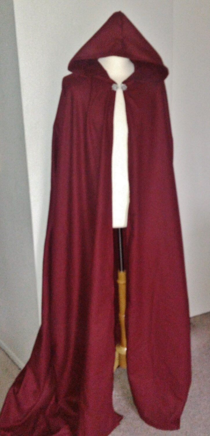 A gold or silver clasp at the neck secures you in the cloak and lets it rest comfortably on your shoulders. The cloak has a nice, full water-resistant hood. By default, the cloaks are 55" long from the shoulder to the ankle (this would be a full cloak on a 5'8' person) but I am happy to make the length whatever you wish. If you would like the cloak lined in your choice of linen color, let me know what color you are looking for and I will hunt it down for you.